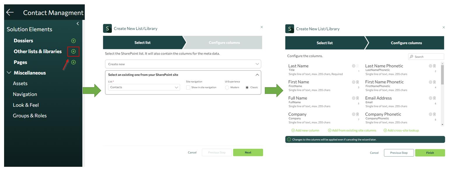- Add all Lists that are related to your configuration to Other Lists & Libraries section. Never use New Dossier with existing list because this will overwrite your configuration!