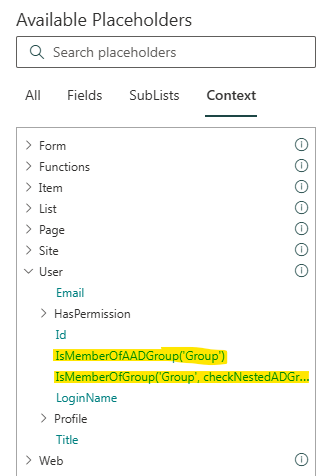 Using a skybow Form (classic or modern) there is a visible expression configuration on each control, not just on fields. In the skybow Expression Builder there is a powerful function in the Context Objects -> User section that can be used to check if a user is in a specific SharePoint or Entra ID Group. The result of this function can be used to show/hide a control on a form.