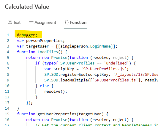 If you are using a multiline function expression and you want to debug your code step-by-step, you can add a debugger; to your code and it will stop there when you run the action and having the Developer Console opened (pressing F12 in your browser).