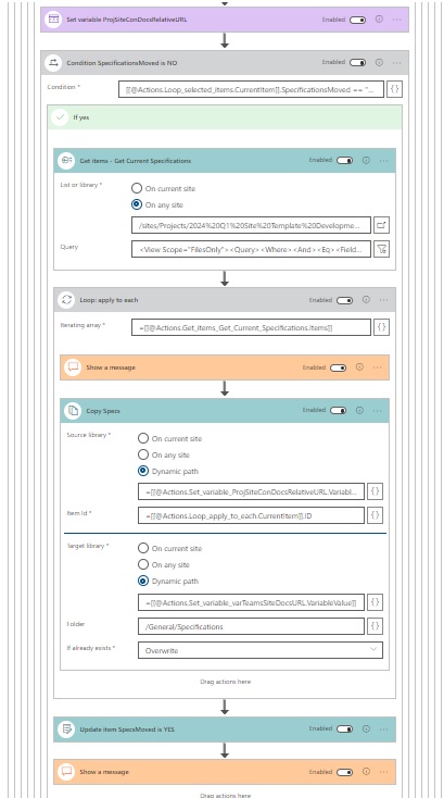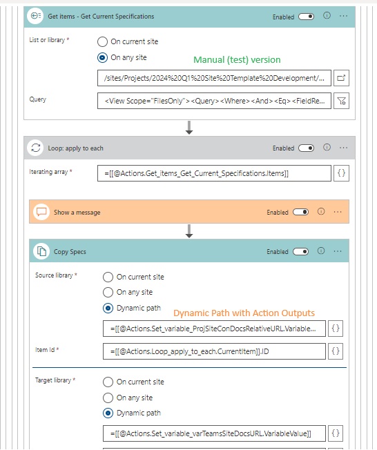 As I said, I ran a test version (manually, hard coded) in Skybow, purely to see if I could move content from the PWA Collection into a normal Teams Site, and it surprisingly loved it. Also: the fact that Copy Files Action has a 3rd, Dynamic Path, is also partially responsible for this ideal hitting me. Either way, this what the hard coded Get Items + Dynamic Copy Files looks like in my test case...