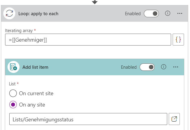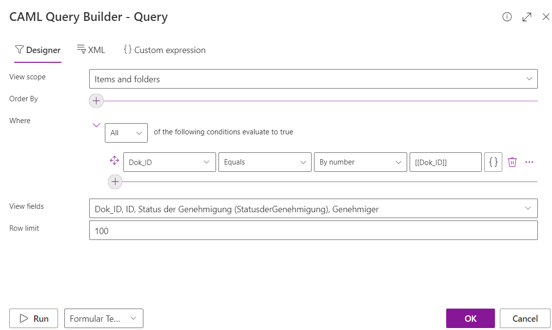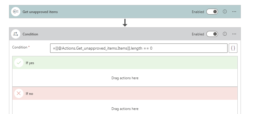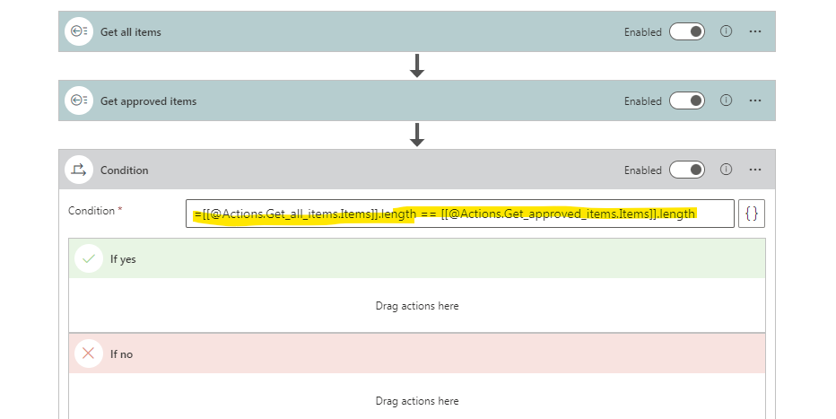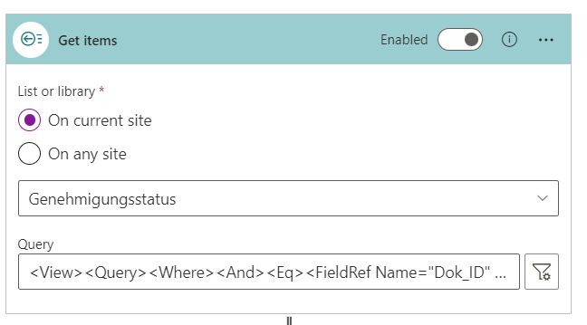 - Use a get items action where you filter on the dok_id and all with status not "genehmigt". If this is 0 then all are approved. But this approach is not as bullet proof as the other one, as it would also be true, when there are no items in the "Genehmigungsstatus" list