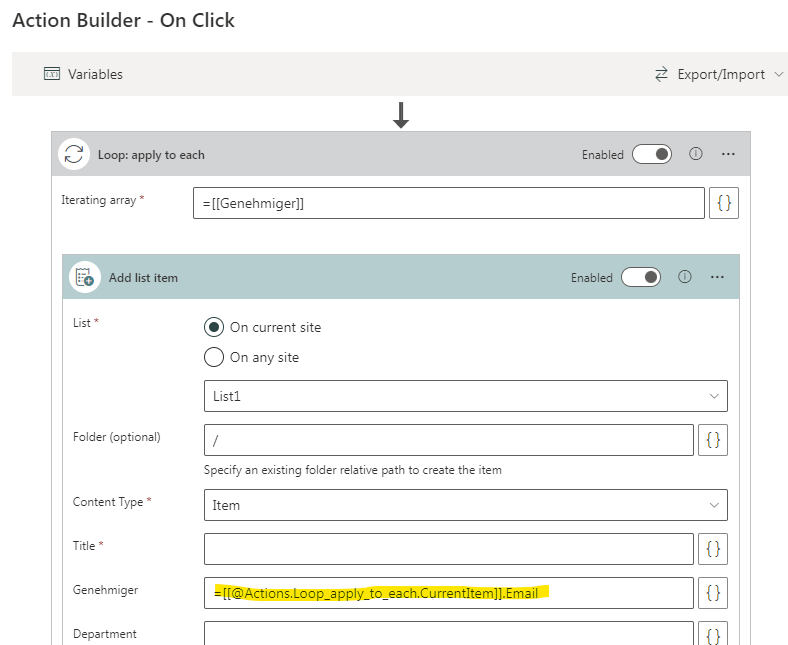 By accessing [[Genehmiger.Email]] directly, it will give you a coma-separated string of emails in the case of multple persons which cannot be set into a person field.