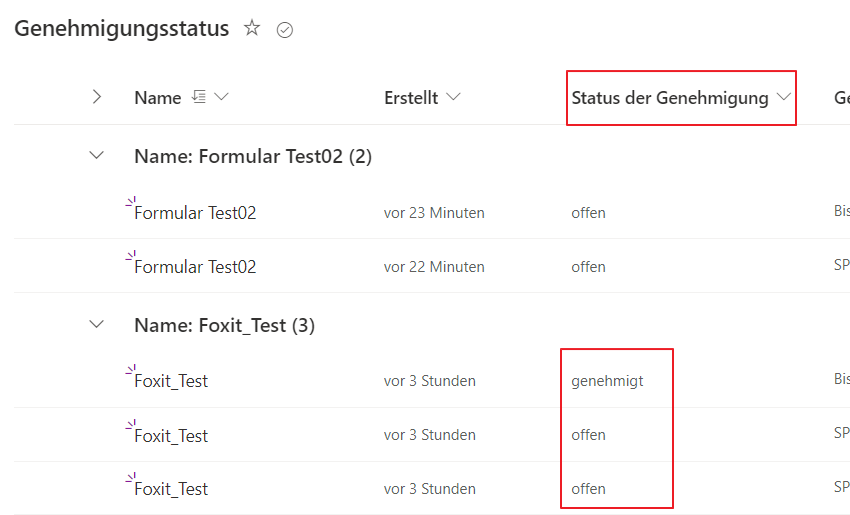 There must be a check if all fields for the corresponding group must have the entry "genehmigt". If yes, then make an entry in the other document library for the corresponding file.