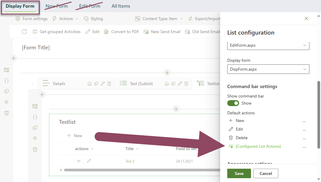 When creating forms for lists used as SubList the command bar options are not available only the three standard actions.