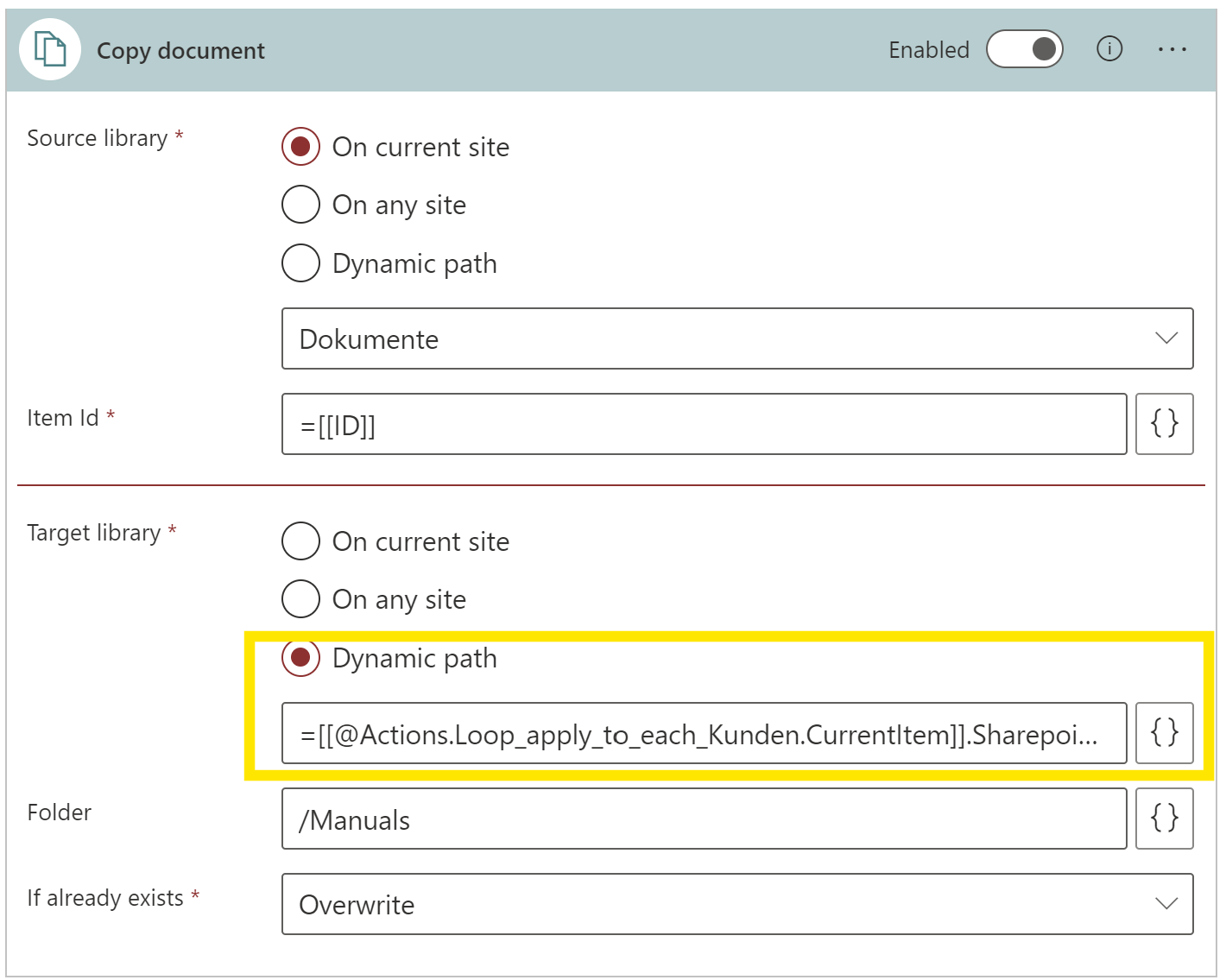 a great feature would be to add the dynamic path"-option (as in list actions) also in triggered actions (e.g. copy file...).