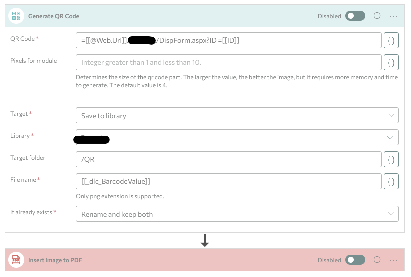 I have also tried to generate a QR code, but the trigger action fails whenever I try to store the it Base64 and insert the image to a *.pdf file or just try to save it to the library (thus both actions are disabled). Adding a file extension (*.png) to the name doesn't make any difference.