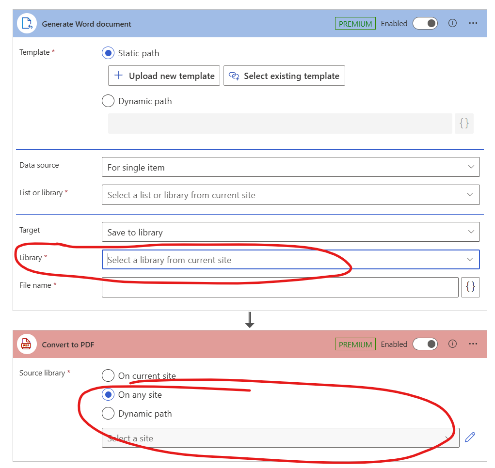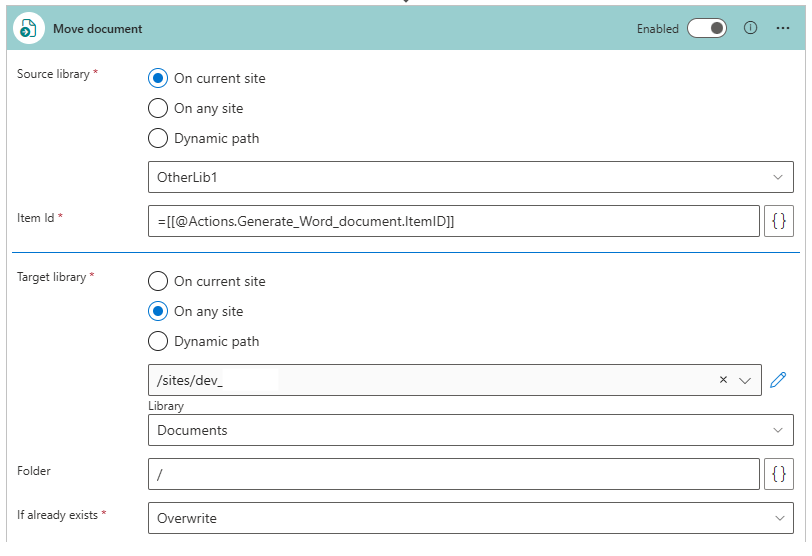 For the source, specify the item created by the “Generate Word document“ action, and set the target library on any desired site.