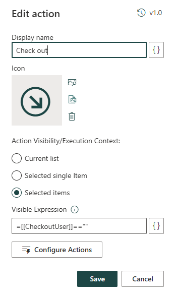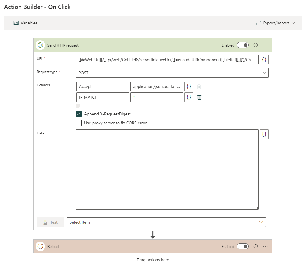 [[@Web.Url]]/_api/web/GetFileByServerRelativeUrl('[[=encodeURIComponent([[FileRef]])]]')/CheckOut()Request Type