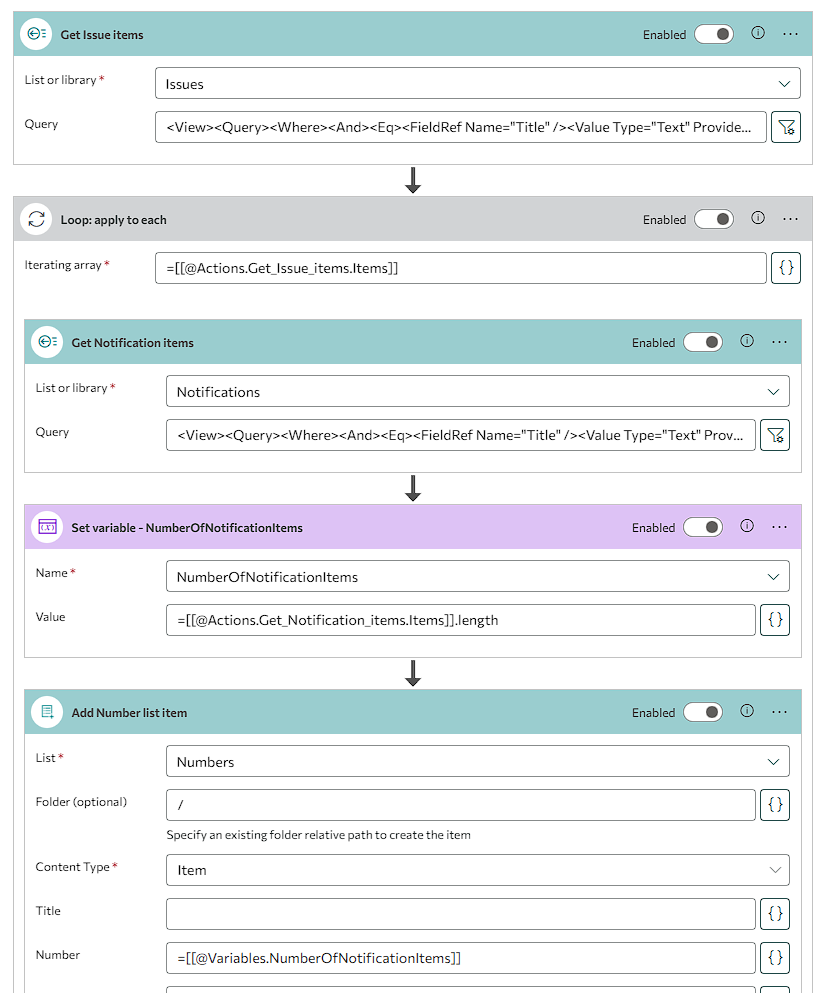 If you want to perform some actions (e.g. Update item) per returned item in that array, you have to configure a Loop (action) and iterate on =[[@Actions.Get_items(2).Items]]0 -