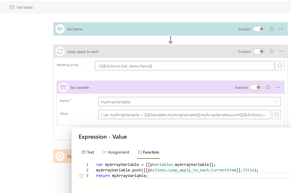 myArrayVariable.push([[@Actions.Loop_apply_to_each.CurrentItem]].Title);