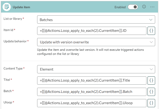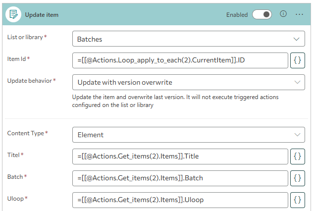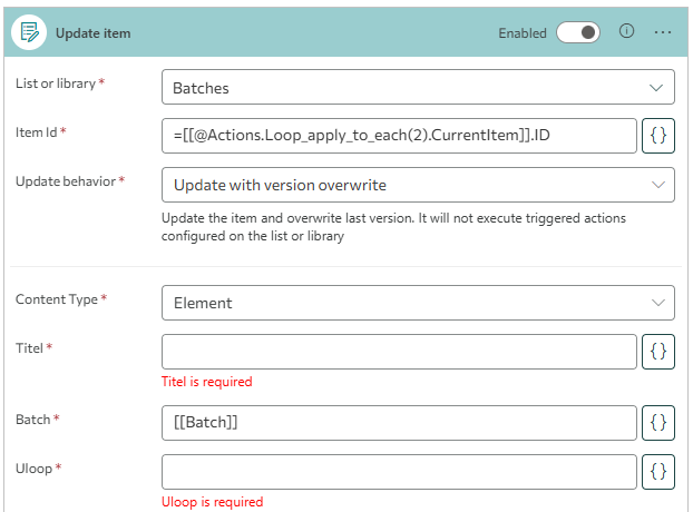 Therefore there must be an issue on another field's expression in your Update item action.And I think I can see one in the screenshot: =[[@Actions.Get_items(2).Items]].Title