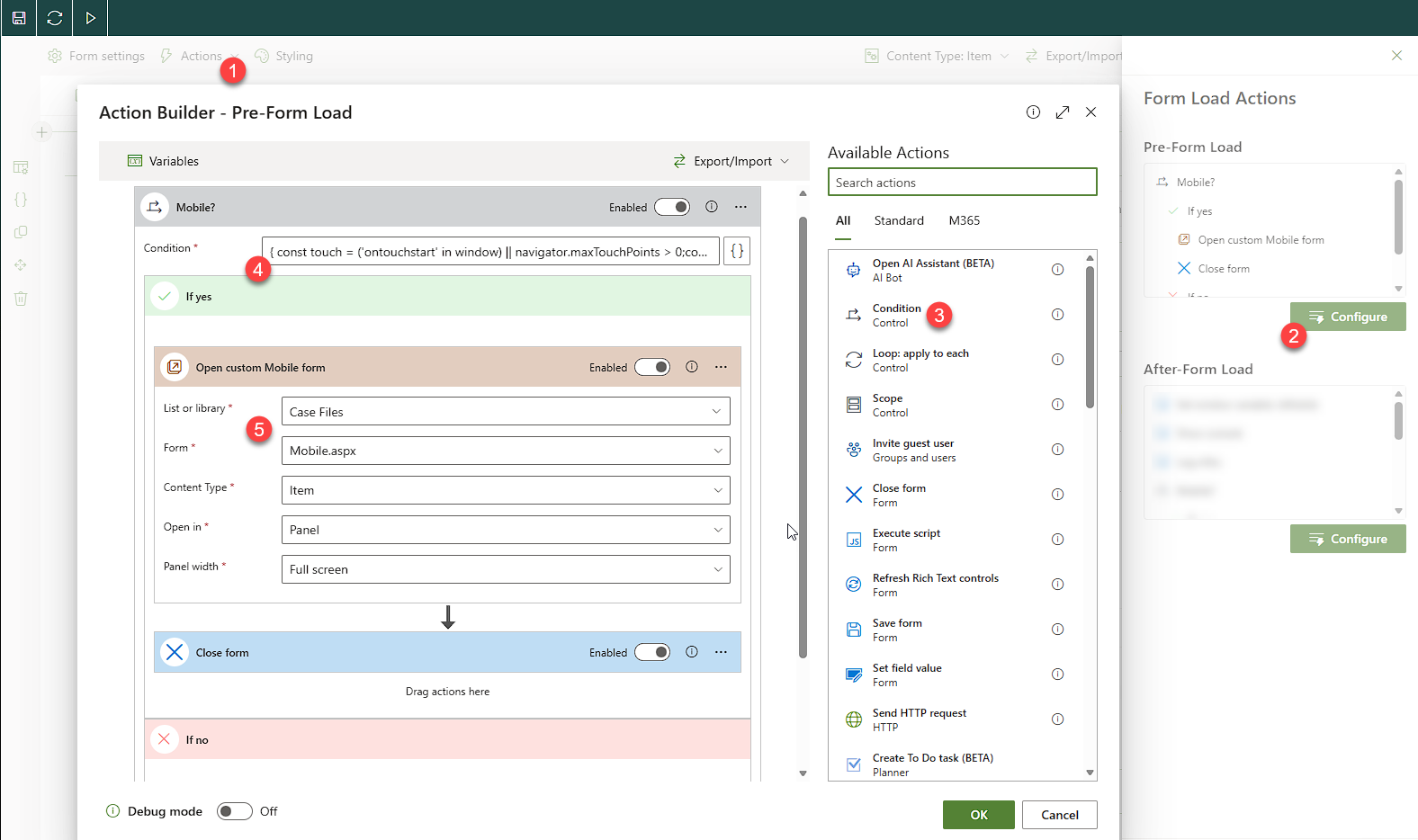return touch && viewport || spMobile;Which can be used in the Condition action (4):