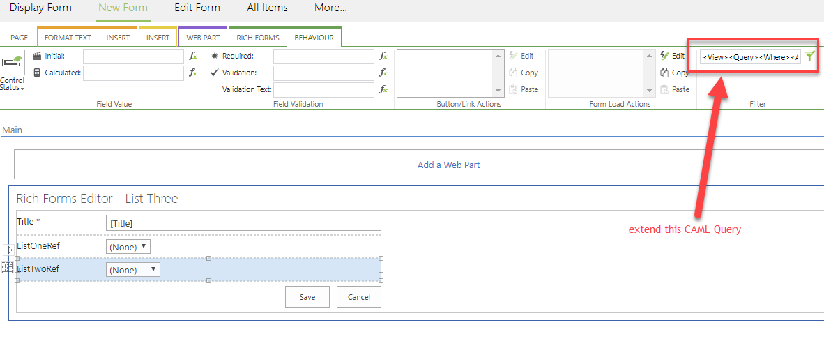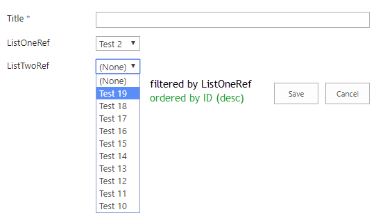 <View><Query><Where><And><Eq><FieldRef Name="ListOneRef" /><Value Type="Text" ProviderType="FormInput">[[ListOneRef.ID]]</Value></Eq></And></Where><OrderBy><FieldRef Name="ID" Ascending="False" /></OrderBy></Query></View>