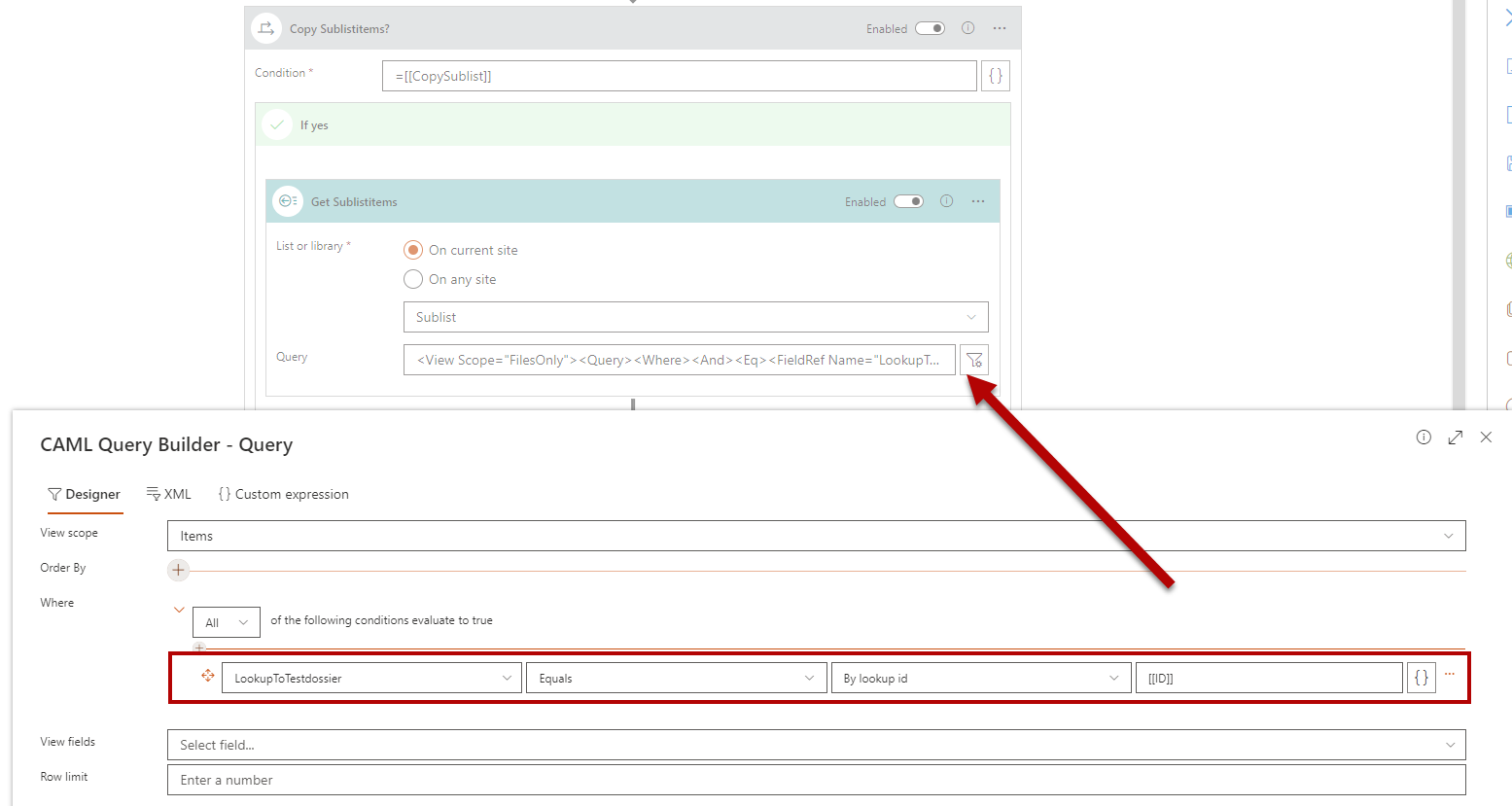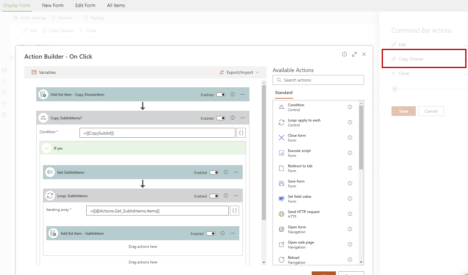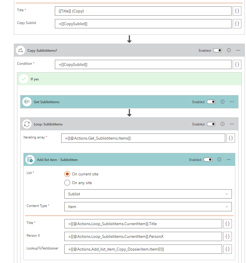 Add list item action - create new items with same values and reference to new created main item (Dossier)