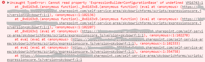 Today I've tried updating our Rich Forms app from version 3.1.7.8 to the latest version 3.1.27.0. The update completed with no errors but when I now try and edit any of the forms in this site they won't load. When I check the developer tools I get a load of errors as shown below:
