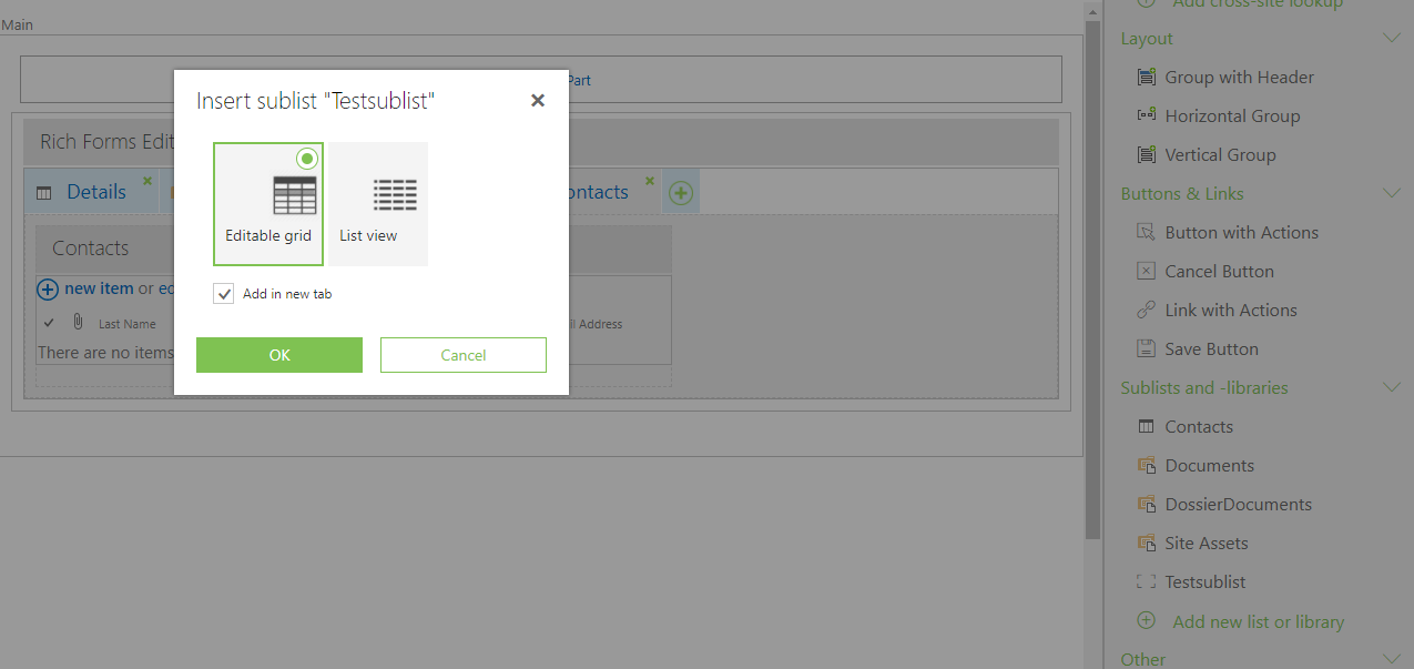 display mode for sublists views on mainitem's form is not a supported feature of Rich Forms Add-In.