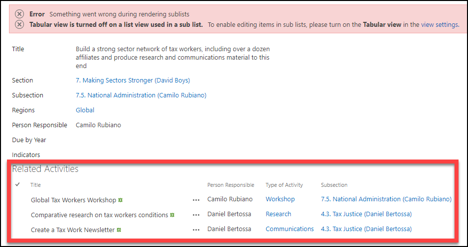 I want to disable editing of the sub list displaying on my form, particularly as it only shows on the display form (not on new or edit). I haven’t found how to do it in rich forms or in the webpart and so went and disabled quick edit on the linked list. This achieves the desired result but displays an error. How can I disable editing from the form while ideally allowing the list to be editable in quick edit when viewing the actual list? In the screen show below the list outlined in red is as wanted but you can see the error at the top.