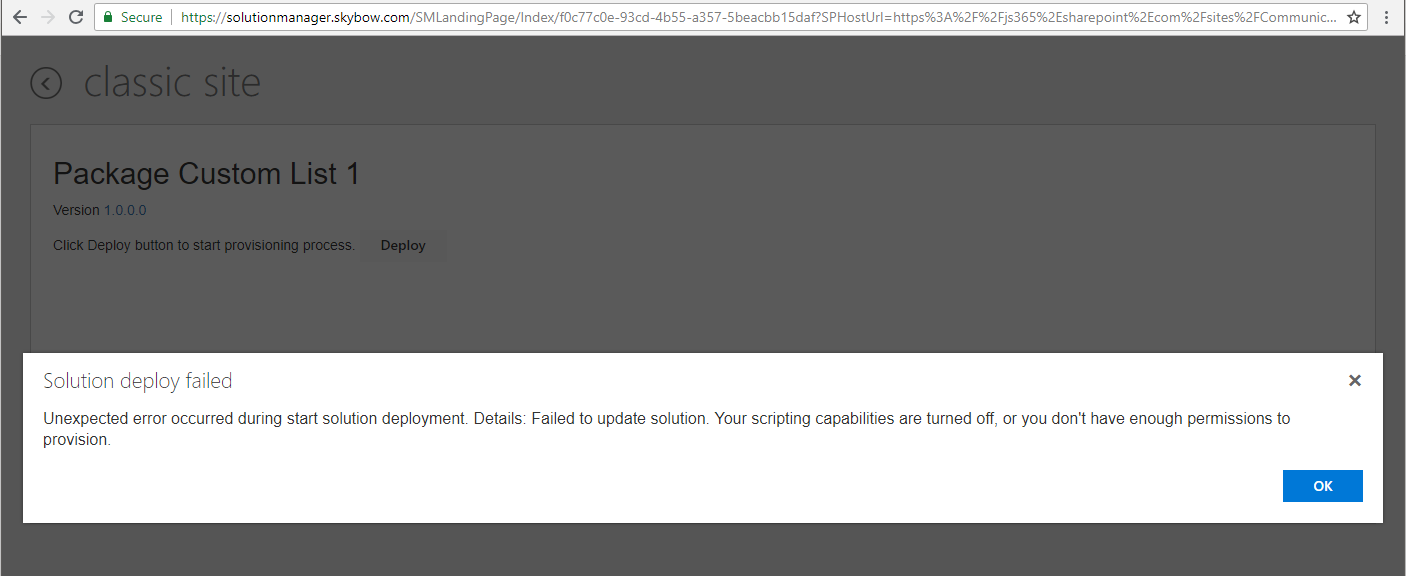 I created a simple solution with a custom list and I am testing packaging and manual deployment. I packaged the solution, downloaded the package and added it to the app store in a different tenant. I can add the app/add-in to a site but when I deploy the add-in I am getting below error. I am global tenant admin and I have enabled the scripting capabilities about 5 days ago so I don't think that is the problem. What could be wrong?