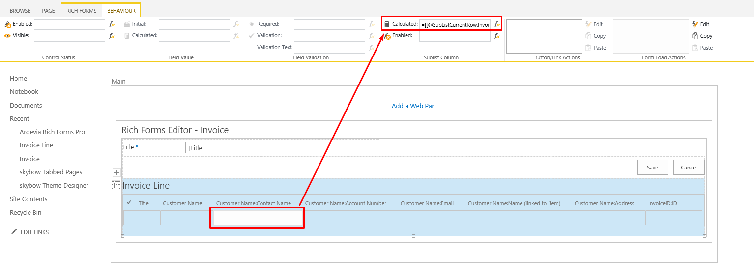 - InvoiceID (linked to Invoice ID on Invoice ListThe Add New form is associated with the Invoice list which has the Invoice Line as a sublist on it. In the Invoice Line Sublist, the user enters a customer name which does a lookup to the Customer List. Once this is selected, I would like the Account Number, Address, Contact and Email to all be defaulted in to the Invoice Line as the values that are currently stored in the Customer List, It is only for validation purposes and the Account Number used for export at some later date.