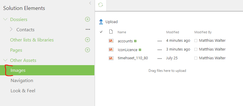 If you choose an icon "From Computer" (figure 1) it will be automatically uploaded to the Images in Solution Elements (figure 2) Therefore they will be packaged and deployed as well.
