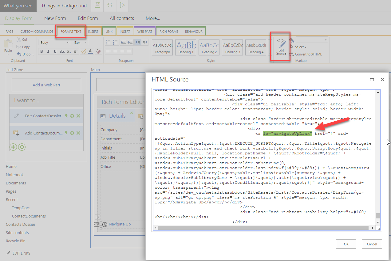 HandleFolder(null, null, location.pathname + "?RootFolder=" + window.subLibraryWebPart.strSiteRelativeUrl + window.subLibraryWebPart.strRootFolder.substring(0, window.subLibraryWebPart.strRootFolder.lastIndexOf('/')) + "&View={" + ArdeviaJQuery("table.ms-listviewtable[summary=" + window.dossierSubLibraryName + "]").attr("view") + "}");Add the following id attribute to your new created link to identify it: id="navigateUpLink"