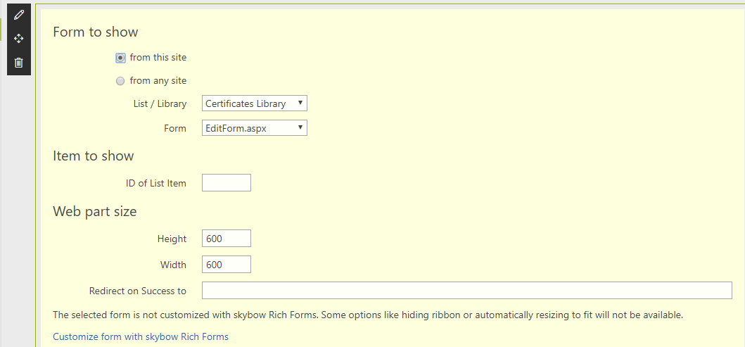 On the configuration screen that pops up once the web part has been added I've chosen a document library with a form that has been customized with SkyBow RF. However, a message appears as shown below saying that the selected form is not customized. Is there any reason why it would think the form hasn't been customized when it definitely has?