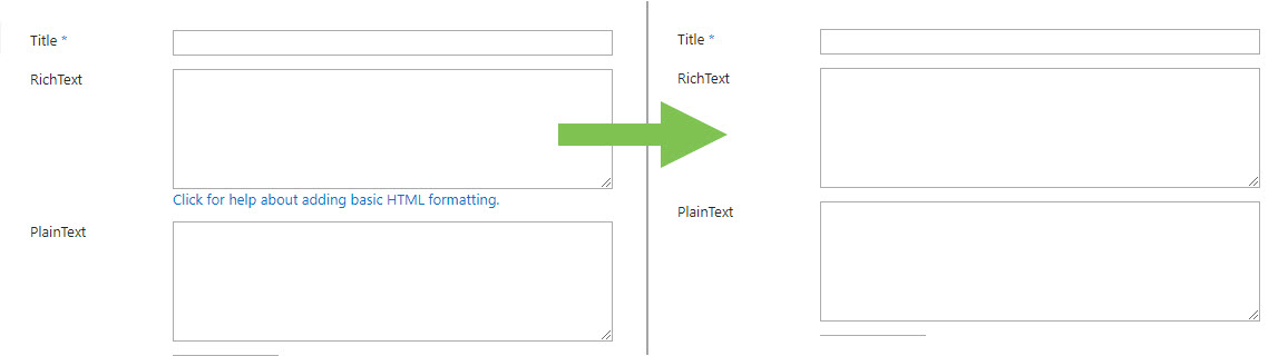 Using RichText Fields in Modern Lists with Classic RichForm Forms, the RichText Fields are rendered with an explanation text at the bottom of each RichText Field. This consumes a lot of space.