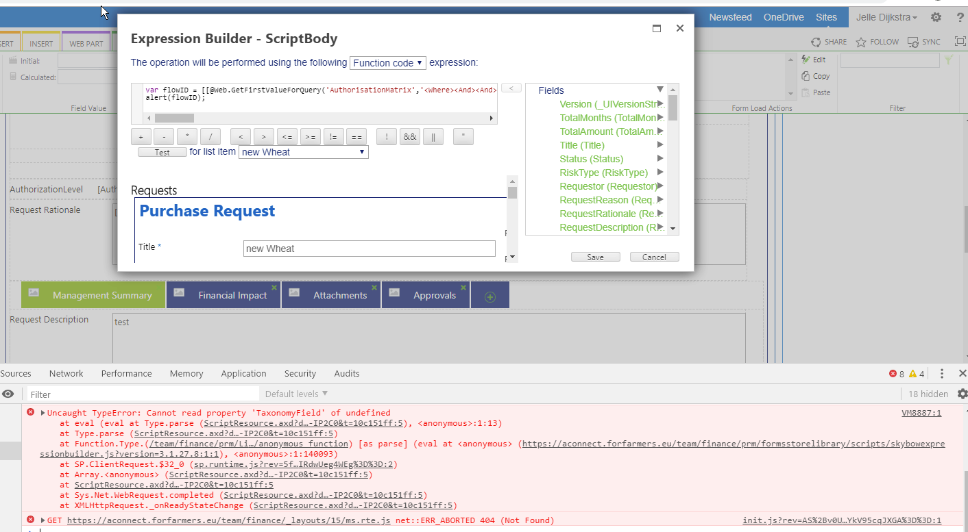 Looking at/in the designmode of the Skybow Editfor, to test the script I see also that at first above error message is shown, but this is when I select a record to test my script on. If I click test afterwards the script is executed well.