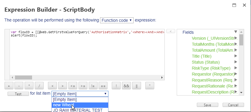 var flowID = [[@Web.GetFirstValueForQuery('AuthorisationMatrix','<Where><And><And><And><And><Eq><FieldRef Name="CategoryType"/><Value Type="Choice">[[ReqCategory]]</Value></Eq><Eq><FieldRef Name="RiskType" /><Value Type="Choice">[[RiskType]]</Value> </Eq> </And> <Gt> <FieldRef Name="months_max" /><Value Type="Number">[[TotalMonths]]</Value></Gt></And><Geq><FieldRef Name="amount_max" /><Value Type="Currency">[[TotalAmount]]</Value> </Geq></And><Contains><FieldRef Name="Country" /><Value Type="TaxonomyFieldTypeMulti">[[BusinessUnits.Country]]</Value></Contains></And></Where><OrderBy><FieldRef Name ="FlowSequence" Ascending=True /> </OrderBy>' , 'ID')]];