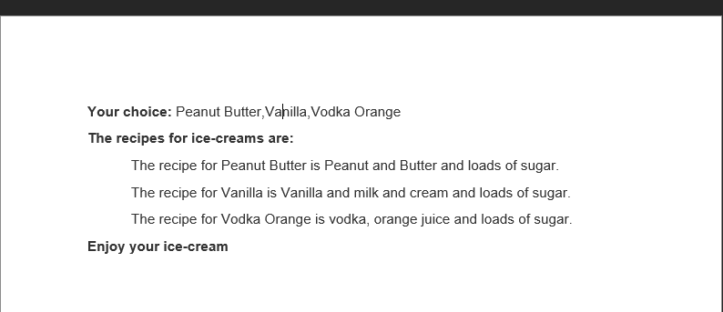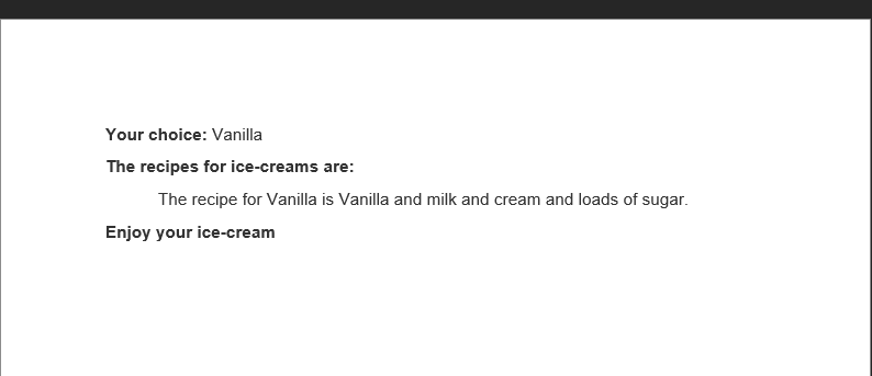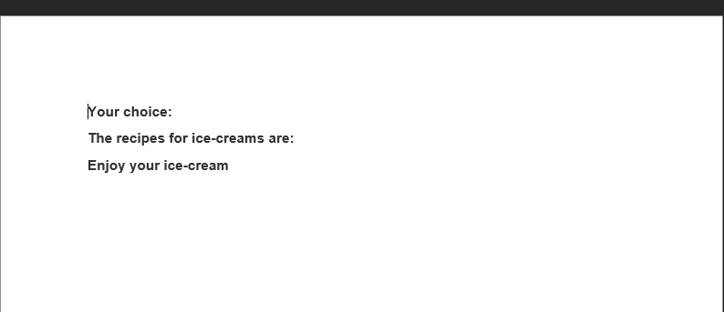 In the example above there is a huge space between the text "Recipes for Ice-creams are:" and "The recipe for Vanilla is Vanilla and milk and cream and loads of sugar." This is because the first option was not selected and therefore will not show. I believe if there is the option to create a loop of some sort, this situation will be solved but in case there isn´t an option for that do you have any tips on how to solve it?