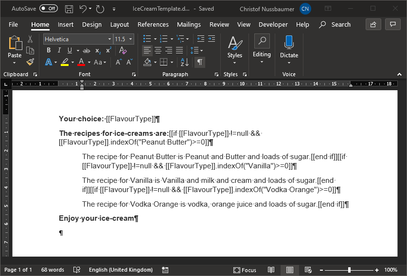 [[if [[FlavourType]] !=null && [[FlavourType]].indexOf("Peanut Butter")>=0]]...[[end if]]2 - The lines works the wysiwyg way: each line break you have in document template will be rendered in generated document - except the linke breaks inside negative If Conditions for sure and this is the point: Place the line breaks inside the conditions.